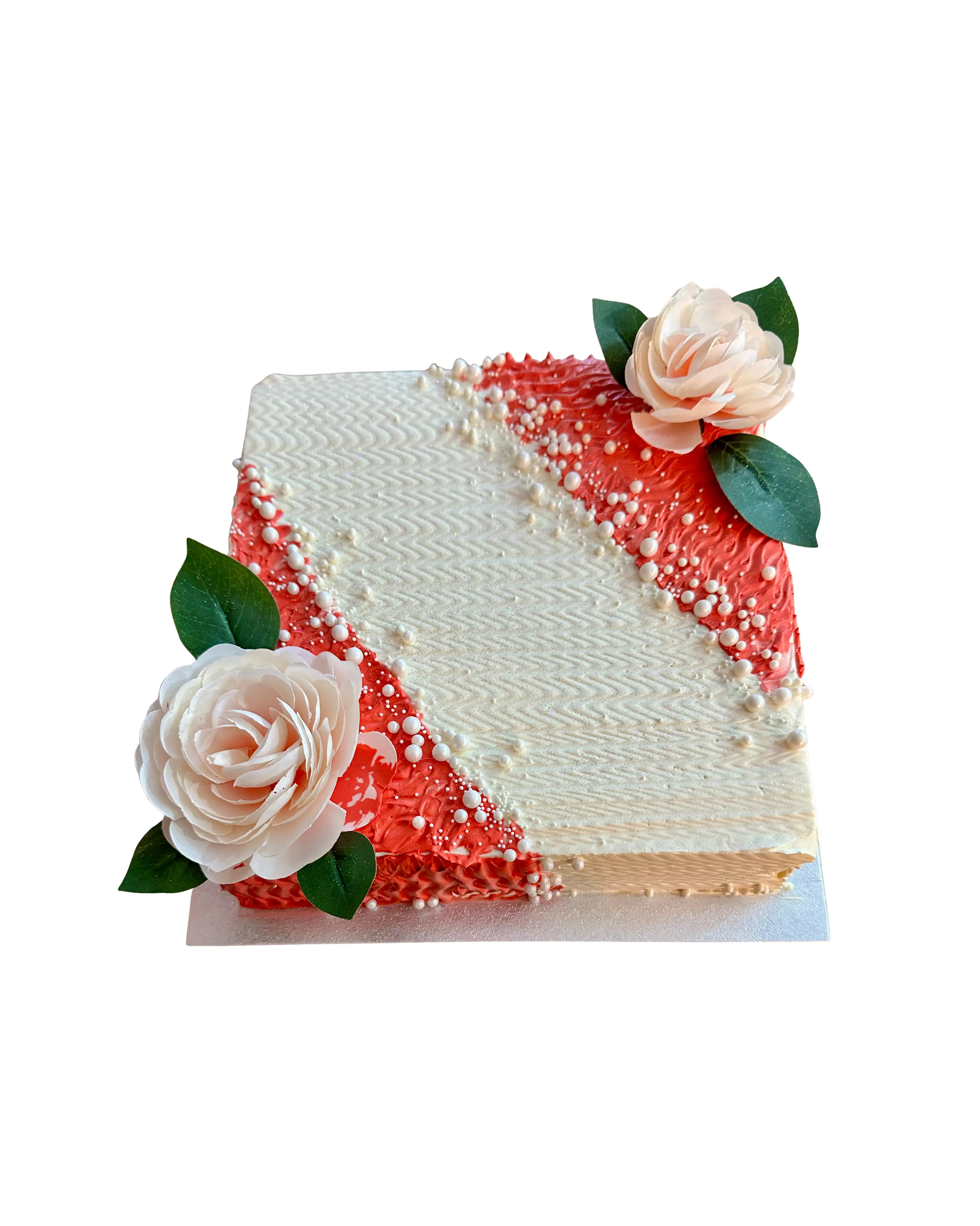 A contemporary square cake featuring a striking diagonal design of textured red and white herringbone freshcream. Adorned with delicate pearls and two beautiful blush roses, it’s a stylish and artistic choice for any modern celebration.