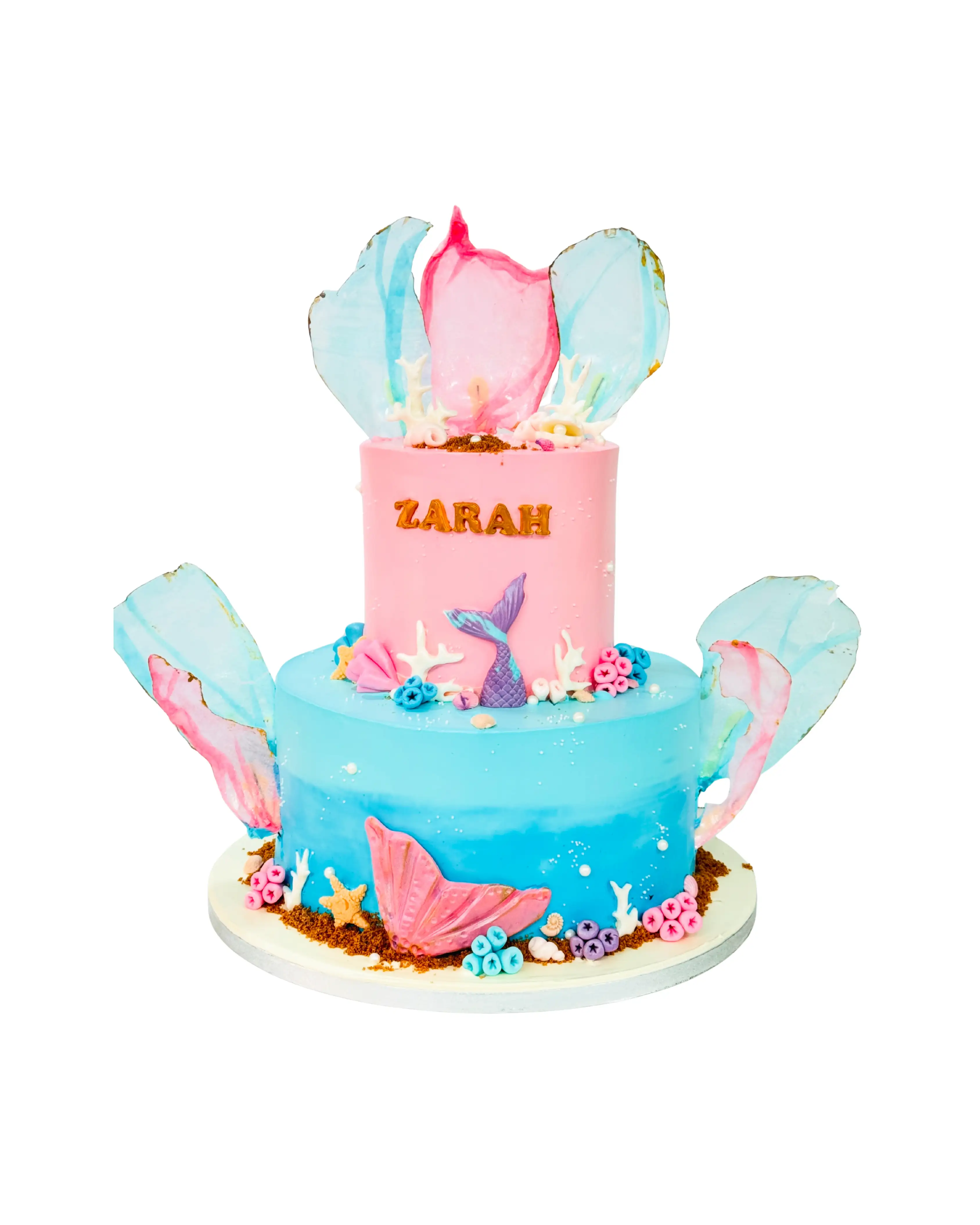 Dive into a magical underwater adventure with this two-tier mermaid cake made of fresh cream. Featuring beautiful pink and blue tiers, fondant mermaid tails, coral, and stunning rice paper sails, it's a true showstopper for a mermaid-themed birthday party.