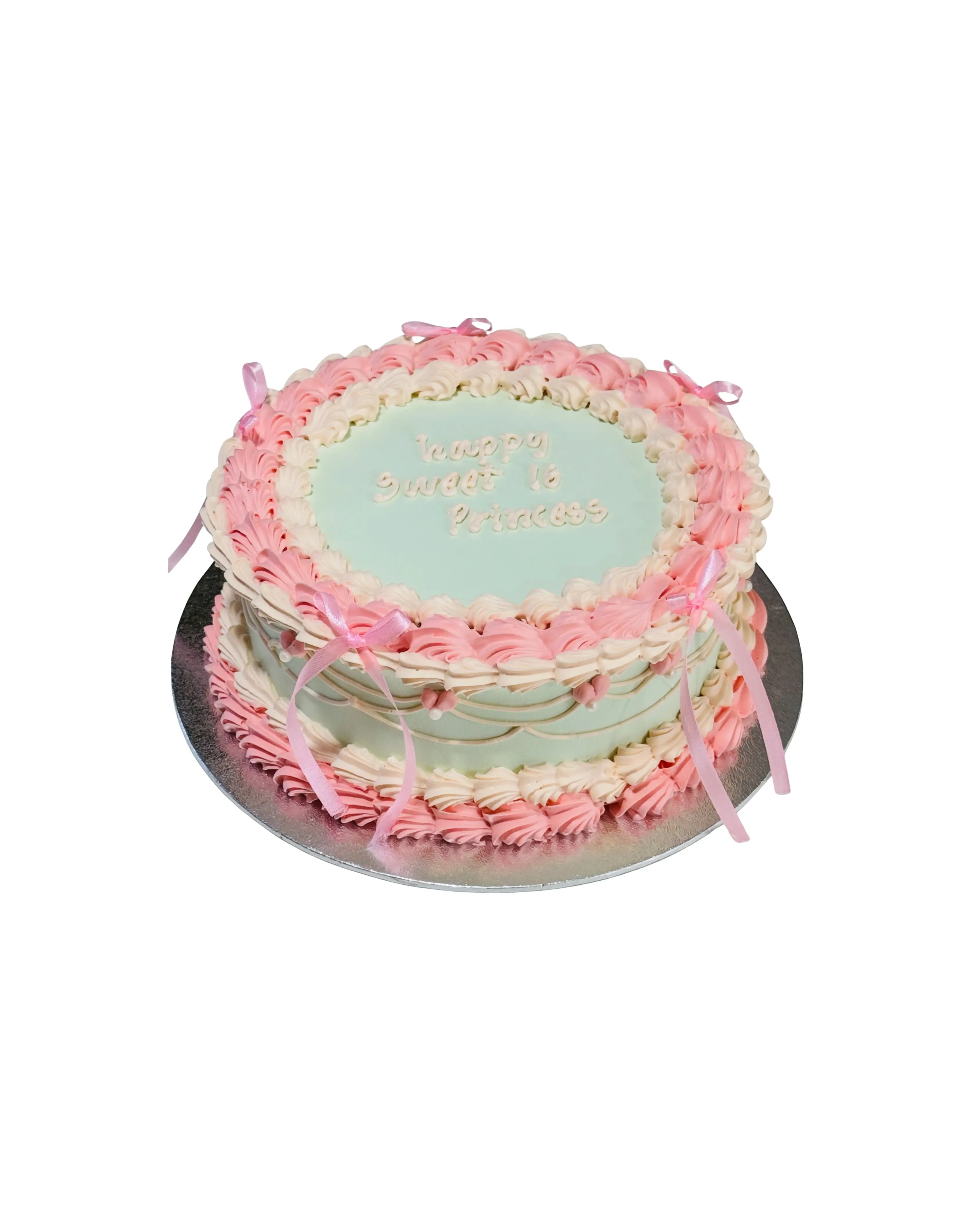 A soft pastel vintage-style cake with elegant pink and ivory piping, finished with delicate ribbon details. Perfect for a sweet 16 celebration, this fresh cream cake brings a timeless, feminine charm to any birthday. Please Note: The message can be personalised to match your celebration.
