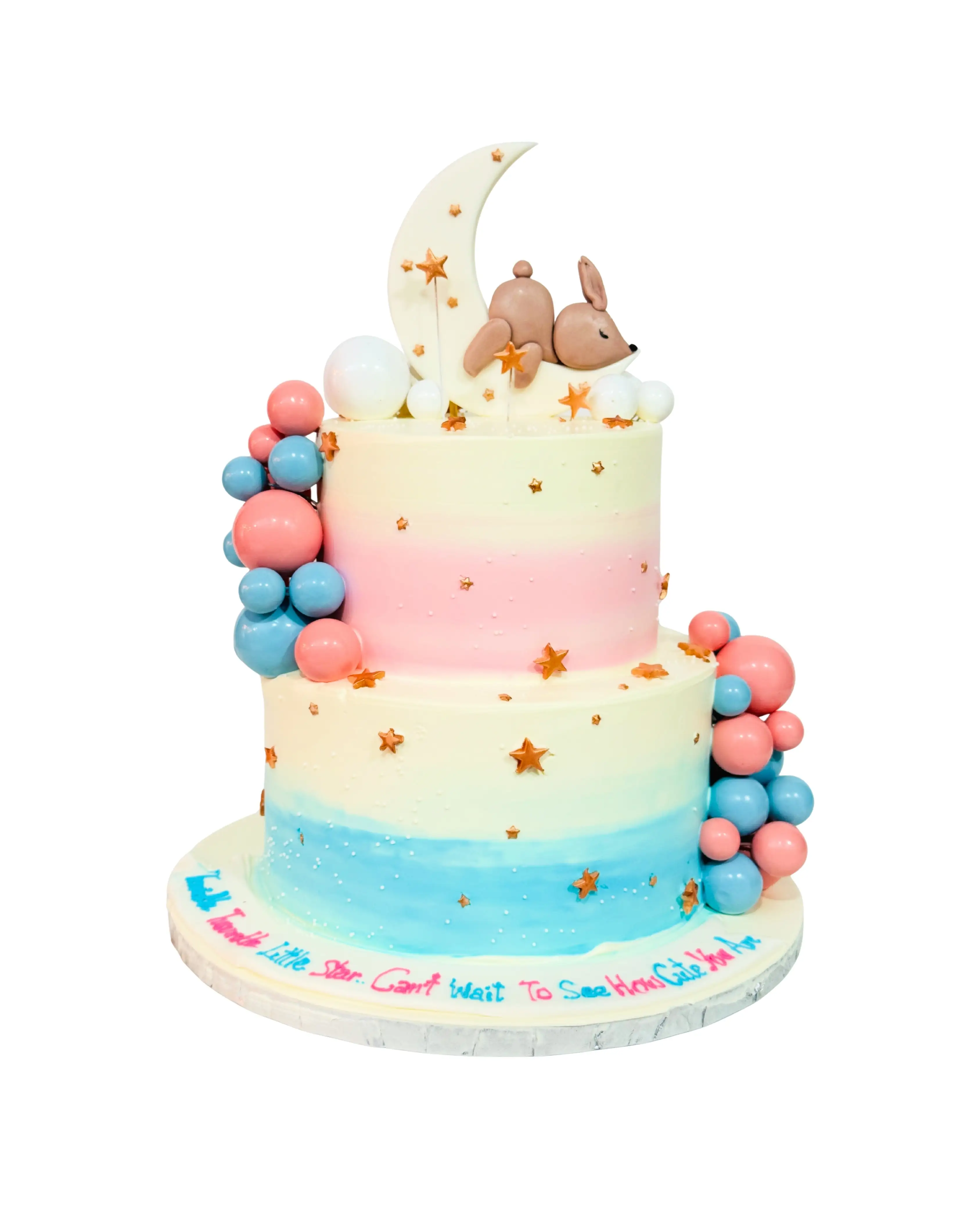 Celebrate the arrival of a little star with our Moon and Stars Baby Shower Fresh Cream Cake. Featuring soft pastel ombré layers, balloon decorations, and a dreamy moon topper, this cake is perfect for baby showers and newborn celebrations.