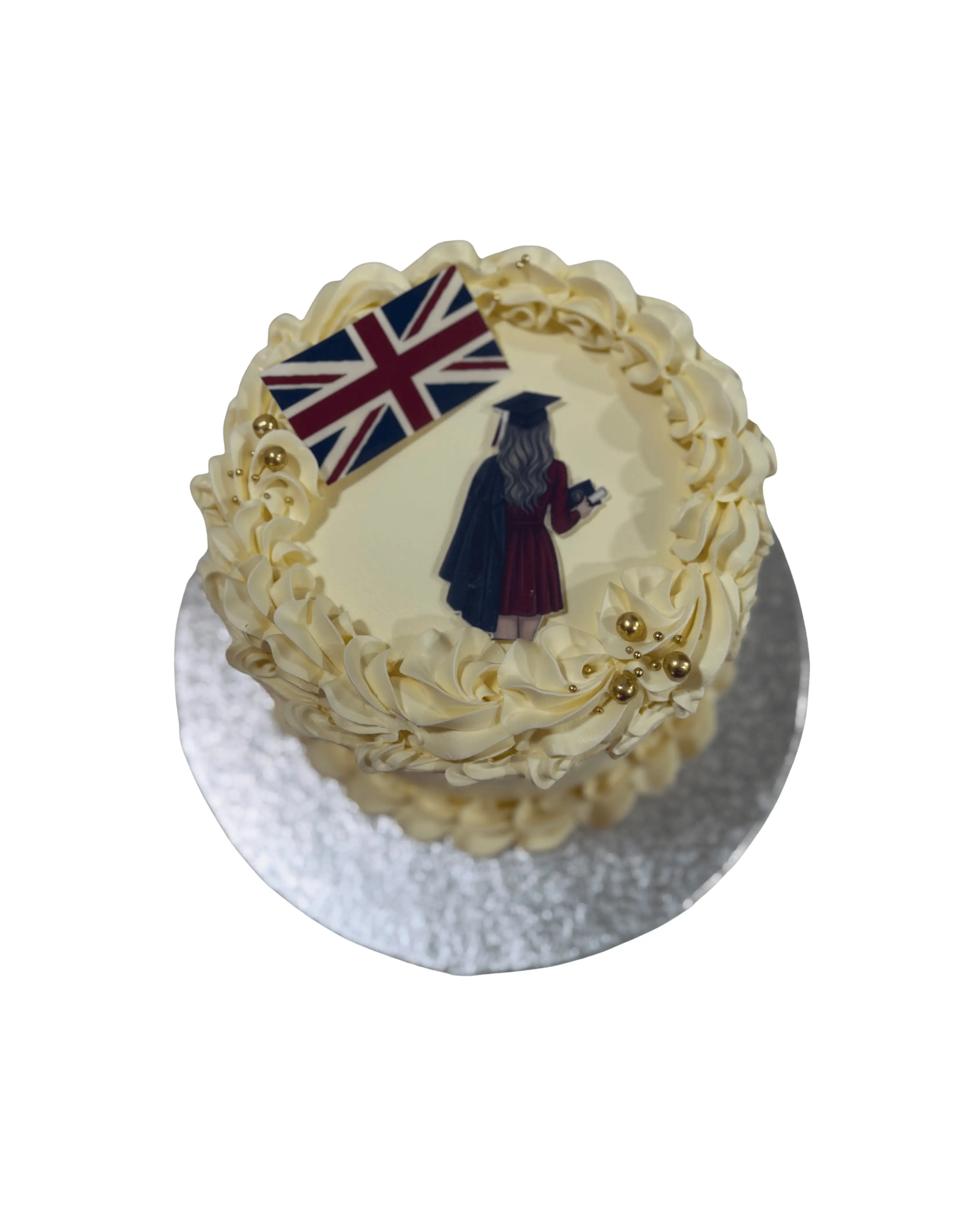Celebrate academic success with our UK Graduation Theme Fresh Cream Cake. Beautifully decorated with whipped fresh cream rosettes, elegant golden pearls, and a graduation topper featuring the Union Jack, this cake is perfect for graduation parties and milestone achievements. Light, creamy, and delicious for a memorable celebration.