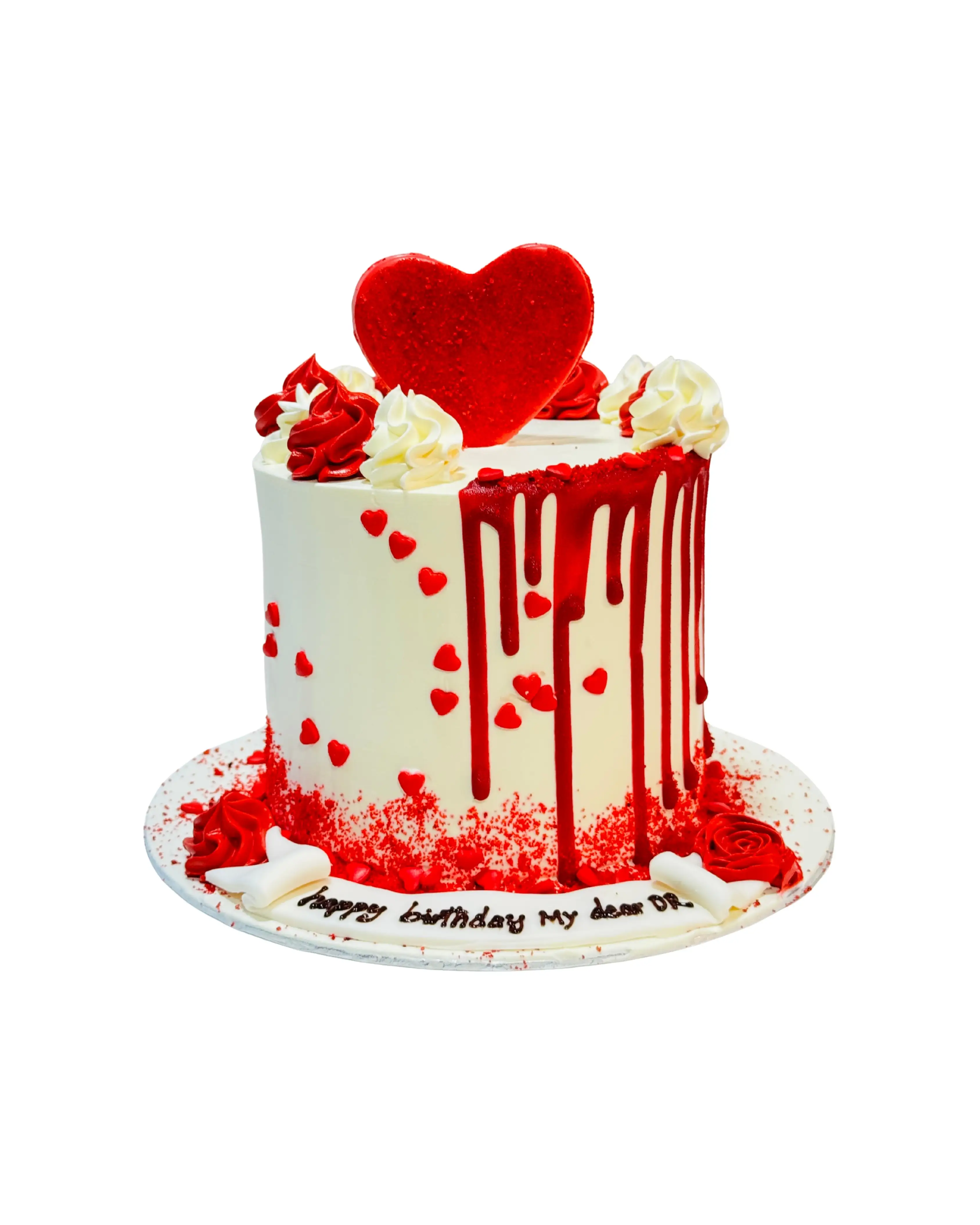 A romantic red velvet inspired fresh cream cake with heart details and dramatic red drip finish. Ideal for anniversaries Valentines Day birthdays and surprise celebrations for loved ones.