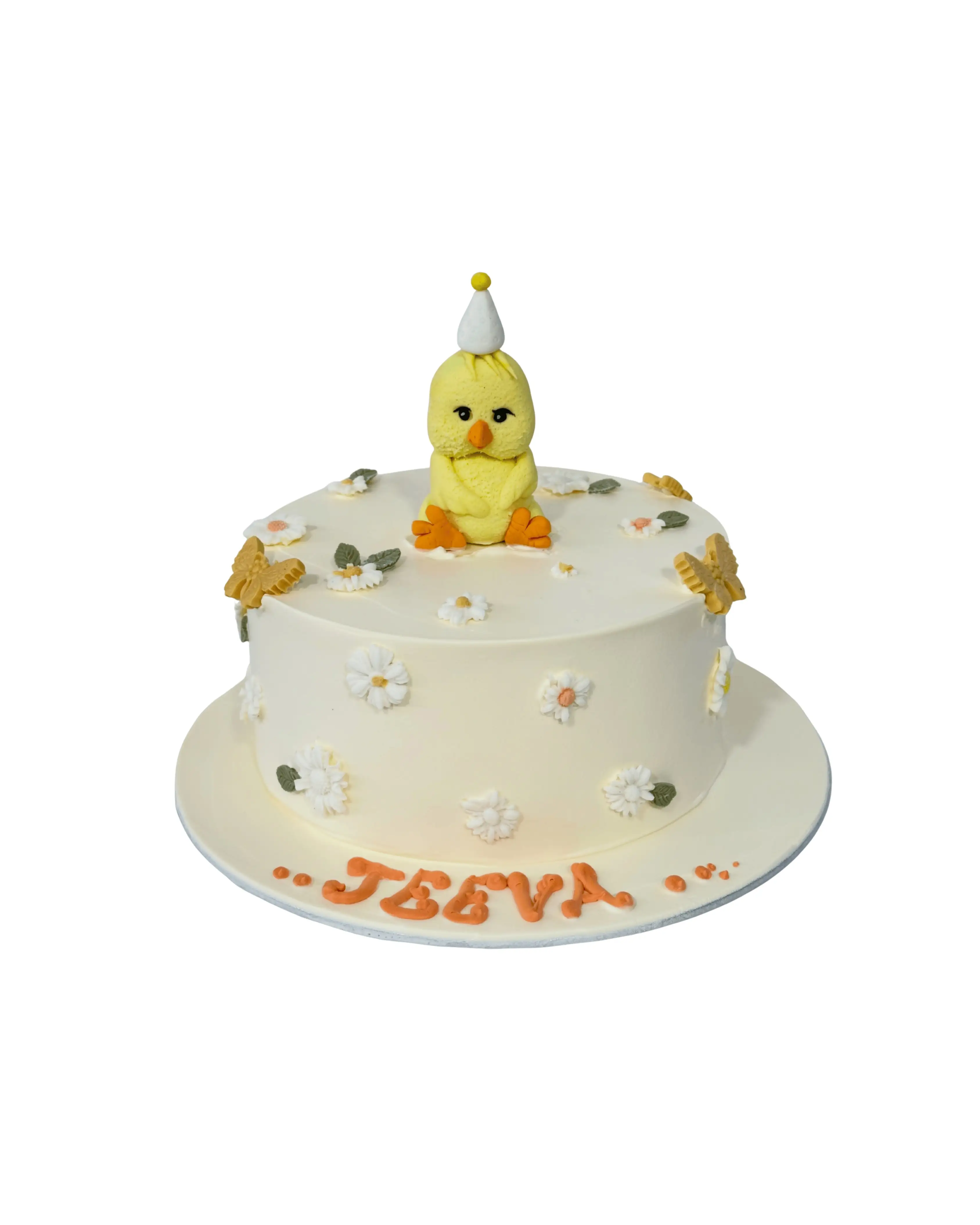 A delightful fresh cream cake featuring an adorable chick topper, soft floral accents, and gentle pastel tones. Perfect for first birthdays and creating a sweet, memorable celebration centerpiece.
