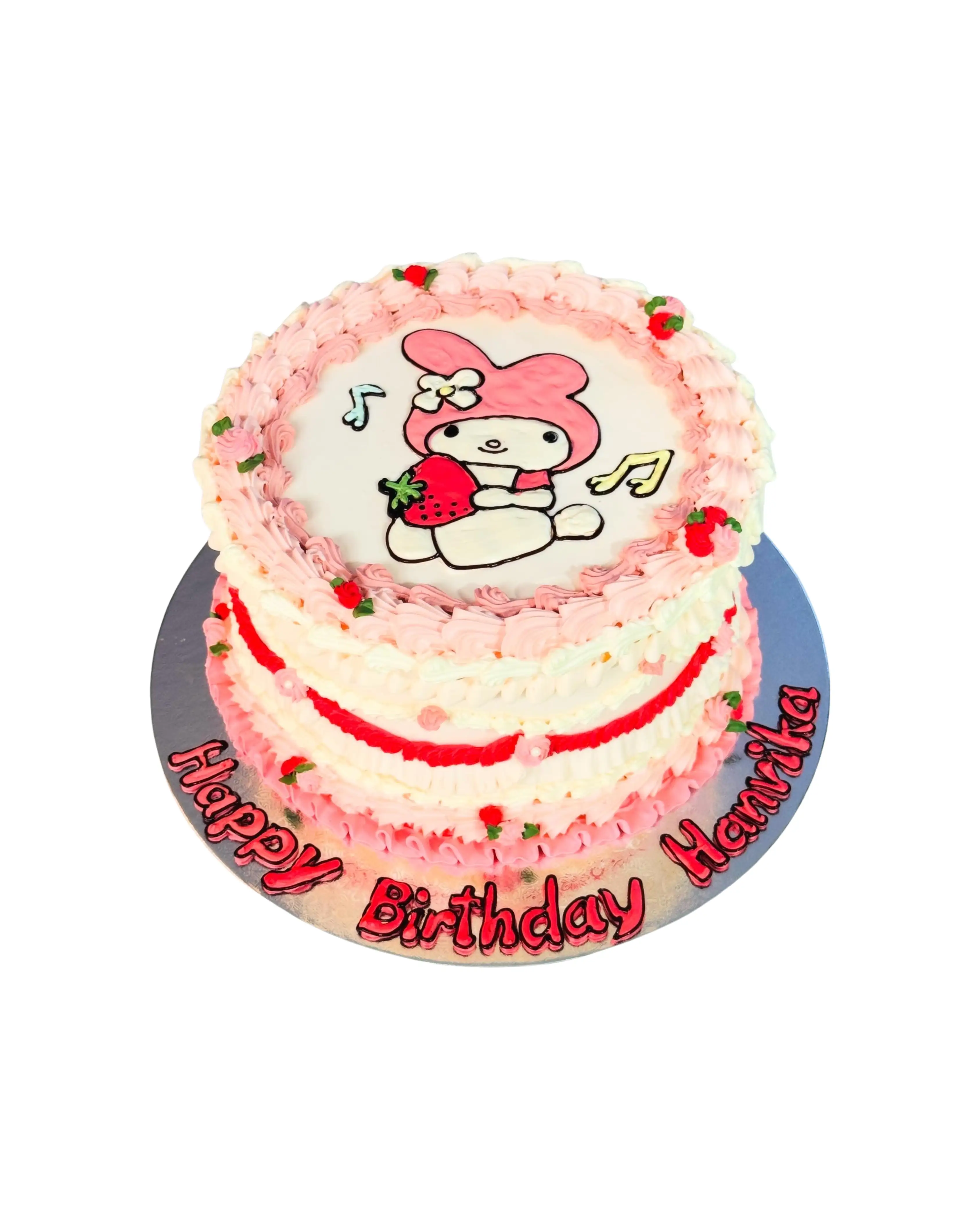 A sweet and charming vintage-style cake featuring the adorable Sanrio character, My Melody. With its beautiful pink and white piped ruffles and cute character art, it's a perfect treat for a fan's birthday celebration.