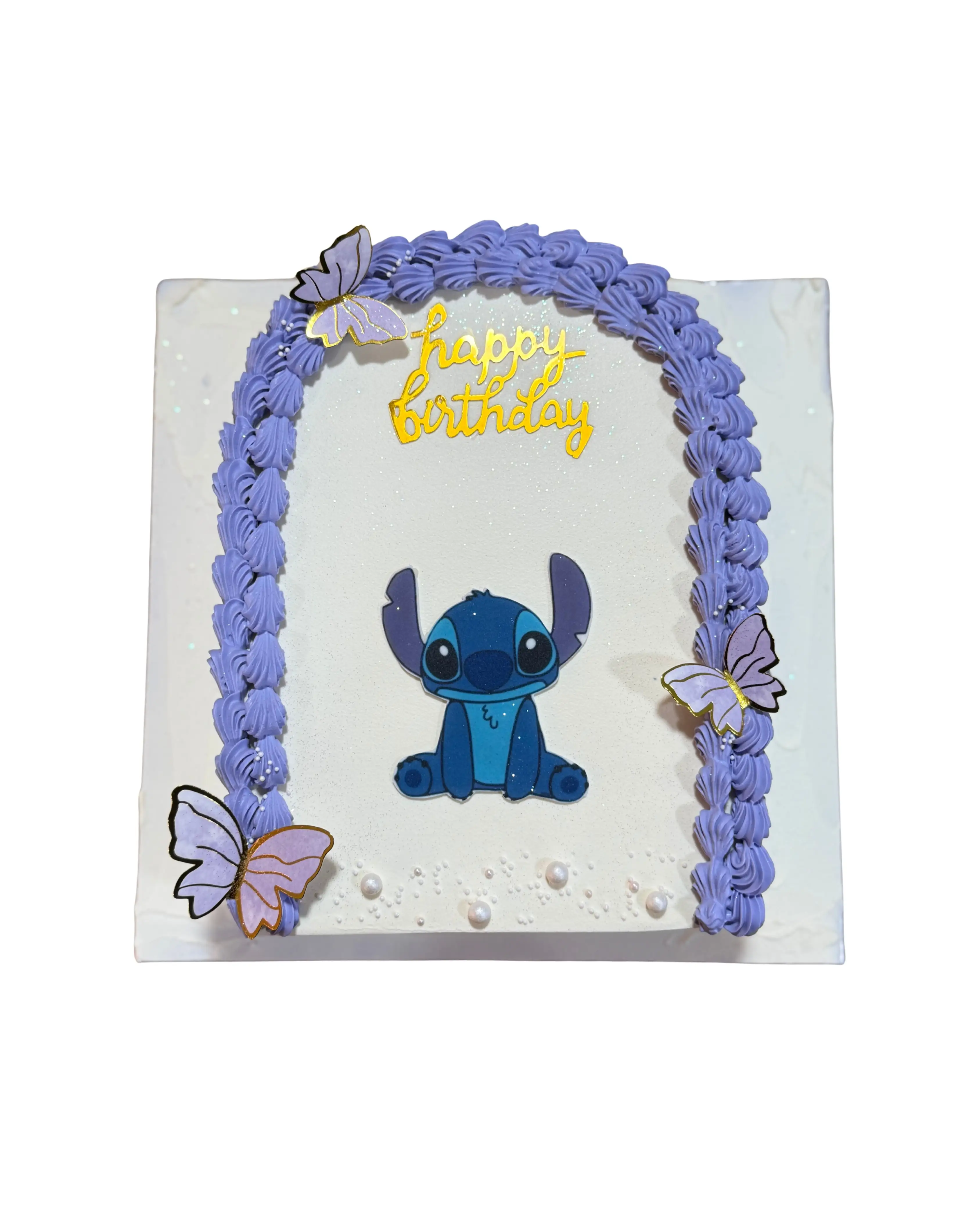 Celebrate special moments with this adorable Stitch-themed fresh cream cake, decorated with soft purple cream piping, butterflies, and a cheerful “Happy Birthday” topper. Light, fluffy, and beautifully crafted, it’s the perfect cake for kids’ birthdays and Disney lovers.